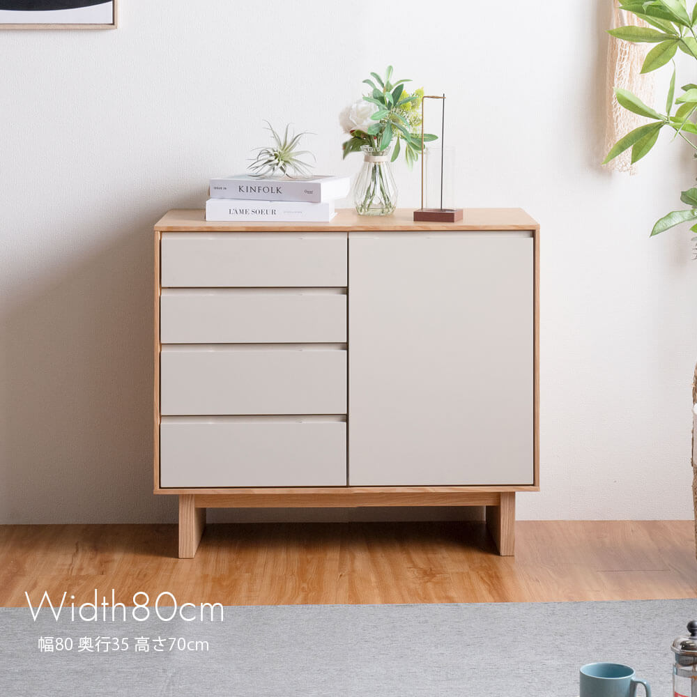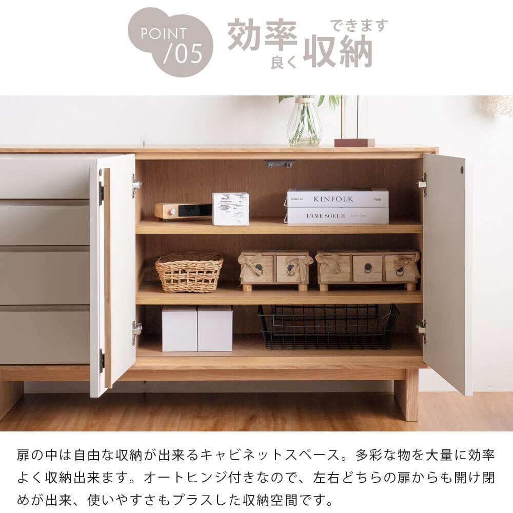 収納力のある引き出しと扉付きの収納スペースは、生活感の出やすいアイテムをすっきり隠してくれます。