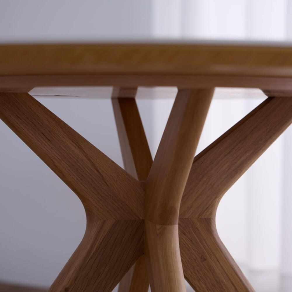優しい表情の円型の天板に、壮観な円を描く脚部にはsongdreamの高度な木工技術が集約されており、その建築的な美しさは見る人を惹きつけます。