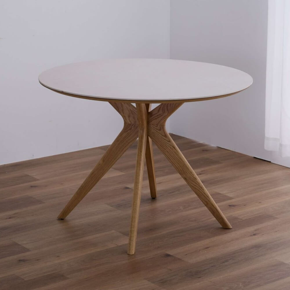 天板形状は正円で同じですが、脚のデザインが多岐にわたり個性が発揮されるのが円形ダイニングテーブルです。天板は天然木やメラミン化粧板、セラミックなどお部屋のインテリアに合わせてお選びください。